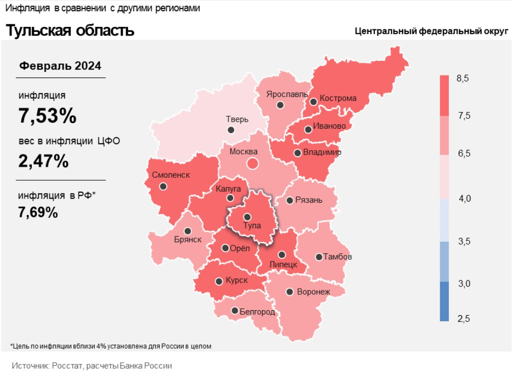 В тульском регионе годовая инфляция увеличилась с 7,44% (такой показатель был в январе) до 7,53% в феврале. Аналогичную динамику эксперты отметили в целом по России и по Центральному федеральному округу. Но региональная инфляция (7,53%) оказалась выше общероссийской (7,69%) и ниже, чем по Центральному федеральному округу (7,49%).