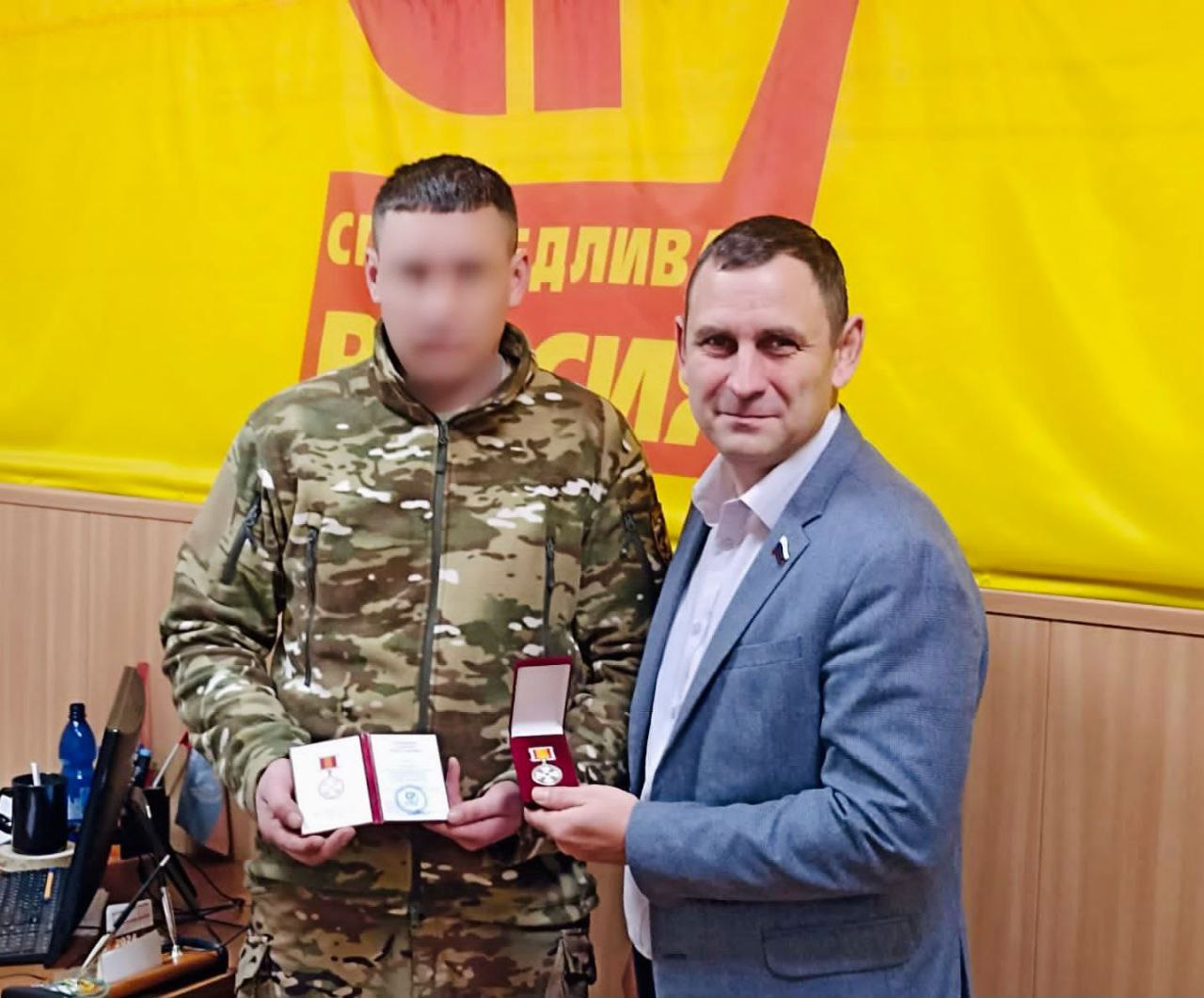 По поручению Президиума партии СПРАВЕДЛИВАЯ РОССИЯ – ПАТРИОТЫ – ЗА ПРАВДУ, руководитель тульского реготделения партии, депутат Тульской областной Думы Сергей Гребенщиков вручил двум жителям Тульской области партийные медали "За воинскую доблесть".