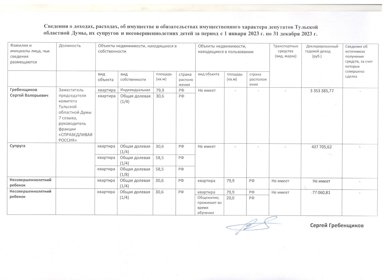 Председатель Совета регионального отделения партии СПРАВЕДЛИВАЯ РОССИЯ – ЗА ПРАВДУ , руководитель партийной фракции в Тульской областной Думе Сергей Гребенщиков уже представил декларацию и опубликовал её в открытом доступе – партийных и личных социальных сетях.