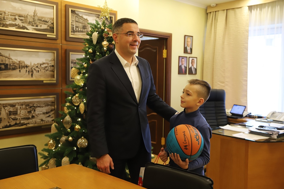 Мэр Тулы пригласил Максима в гости и вручил подарок. Алексей Эрк пообщался со школьником. Он пожелал юному баскетболисту спортивных достижений, успешной учебы и веселых праздников.