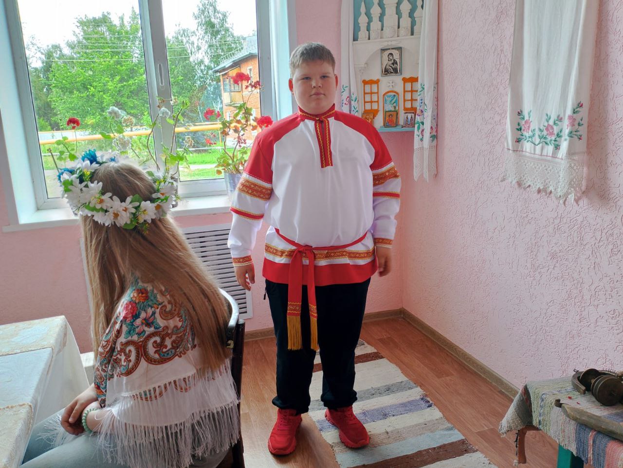 Ведущая мероприятия Нина Смирнова рассказала ребятам познавательную историю о том, как подружились «Сарафан» и «Рубаха». Присутствующие смогли не только увидеть, но и примерить на себя косоворотку, сарафанный комплекс, лапти и головные уборы.