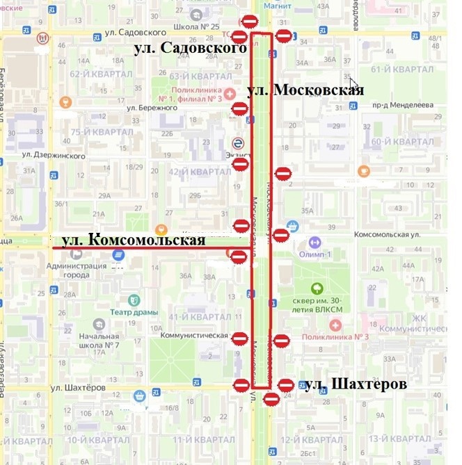 - ул. Шахтеров, ул. Коммунистическая, ул. Комсомольская, ул. Кирова, ул. Дзержинского, ул. Бережного, ул. Садовского - на пересечении с ул. Московской по четной и нечетной стороне.
