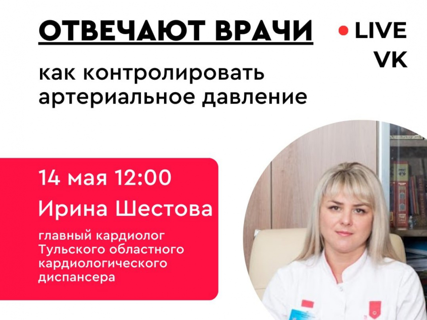 Завтра, 14 мая в 12:00 в прямом эфире группы тульского минздрава «ВКонтакте» на вопросы туляков ответит главный кардиолог Тульского областного кардиологического диспансера Ирина Игоревна Шестова.