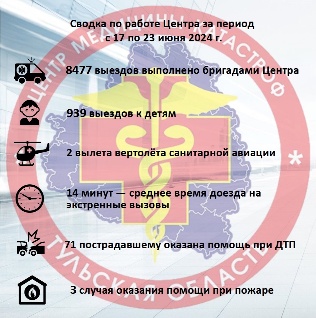 Центр медицины катастроф опубликовал статистику за период с 17 до 23 июня За прошедшую неделю тульские медики выезжали к пациентам почти 8,5 тысяч раз.